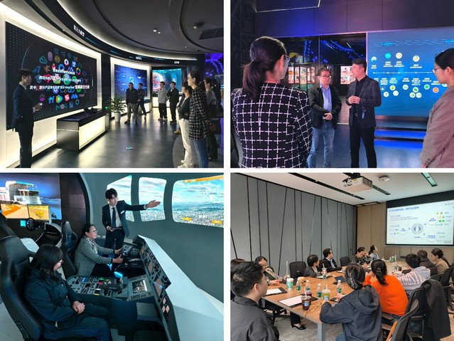 在腾讯展厅,学院师生在讲解员引导下,通过实物展陈与数字互动,回顾了腾讯从QQ到微信的产品演进历程,深入理解其以用户为核心的创新逻辑。师生们现场体验了多项前沿科技应用:腾讯会议的裸眼3D视频通话和天籁降噪技术展现沉浸式交互,工业车辆5G远控平台展现工业互联网的高精度控制,全动飞行模拟机则依托数字孪生技术带来逼真操控体验。互动体验使云计算、人工智能等尖端技术变得可感可知。“数字敦煌”虚拟场景生动展现了科技赋能文化传承的新路径。腾讯在公益、乡村振兴、无障碍等领域的实践案例,诠释了腾讯“用户为本,科技向善”的使命担当,加深了师生对科技企业社会责任与创新实践的理解。在参观过程中,腾讯教育上海商务总监李凯就腾讯与学校已有的互动合作以及与国产直播