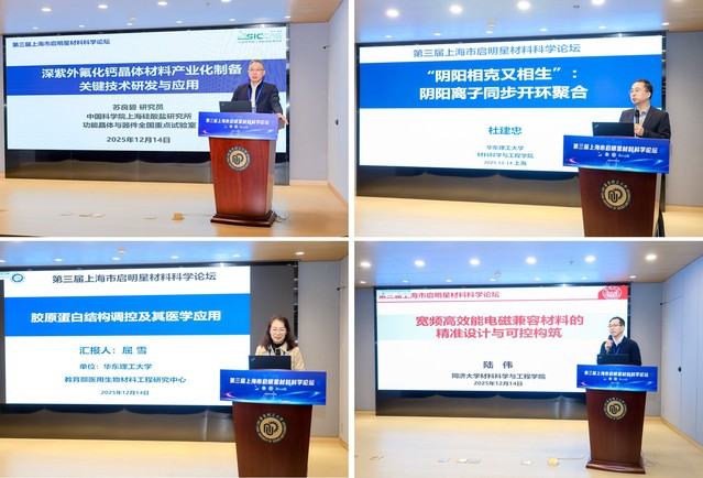 近日,由上海市科创启明星协会材料分会、上海市青年科技人才协会主办,华东理工大学、中国科学院上海硅酸盐研究所承办的“第三届上海市启明星材料科学论坛”在先进材料大楼顺利举行。副校长李春忠出席论坛并致辞。中国科学院上海硅酸盐研究所所长苏良碧、上海市科创启明星协会秘书长顾庆生、协会材料分会主任委员刘宣勇共同出席会议。校内外相关领域,50余位科研院所和企业专家学者、团队师生代表参加本次论坛。开幕式由国产直播